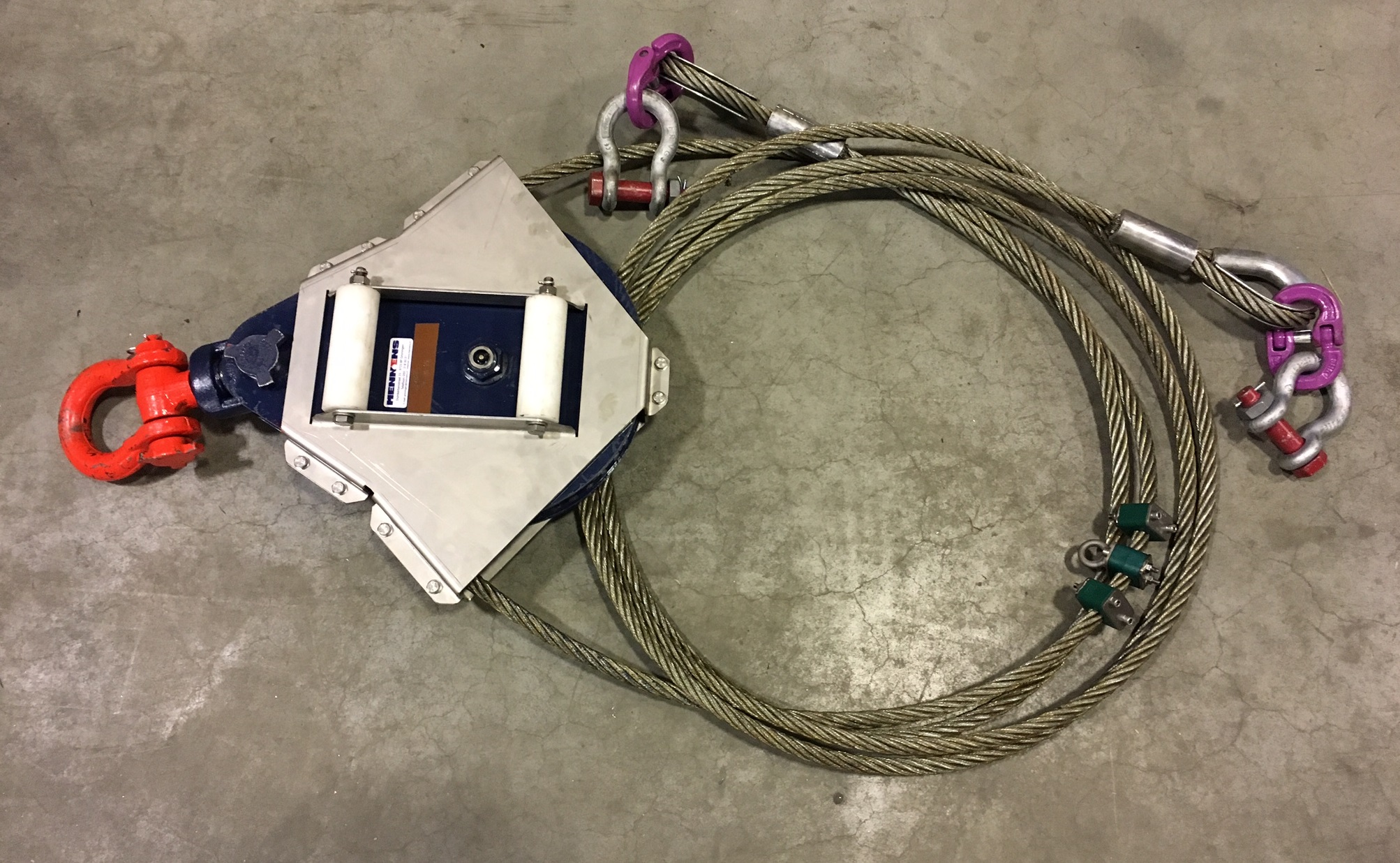 Because the sling runs over a sheave the load handling capabilities of the single joint elevator, lowered and lifted by the backpacker Single Joint Compensator System is 3 metric Ton with the 1,5 Ton extended cylinder assembly, or 5 metric Ton with the 2,5 metric Ton extended cylinder assembly.
