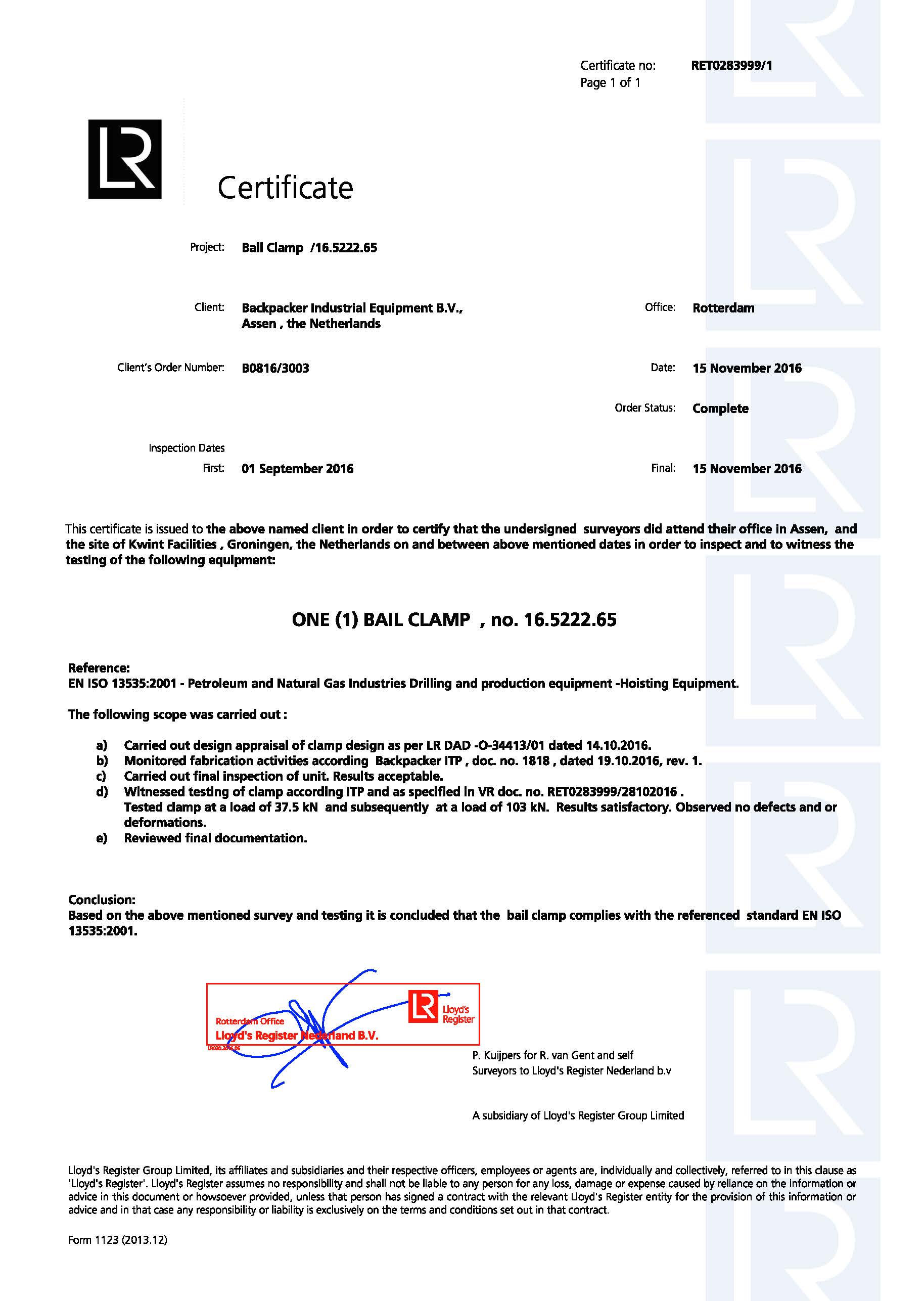 Product verification, from design through strength / stress analysis all the way up to the break load test, was carried out by Lloyd's Register.